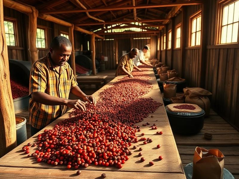 Beans are dried on raised beds under controlled conditions, regularly turned to ensure even moisture reduction to 11-12%.